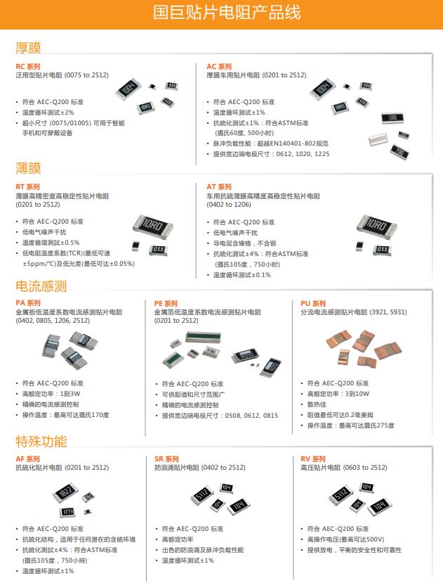 國巨是全球最大的貼片電阻供應(yīng)商之一,在汽車、工業(yè)、替代能源和消費(fèi)電子等主要市場鄰域提供各種應(yīng)用。國巨提供完整貼片電阻產(chǎn)品系列,涵蓋汽車級(jí)金屬電流測電阻、精密薄膜電阻、厚膜防浪涌電阻、抗硫電阻、高功率電阻、高電壓電阻、排阻、小型010050075等,全方位解決方案。