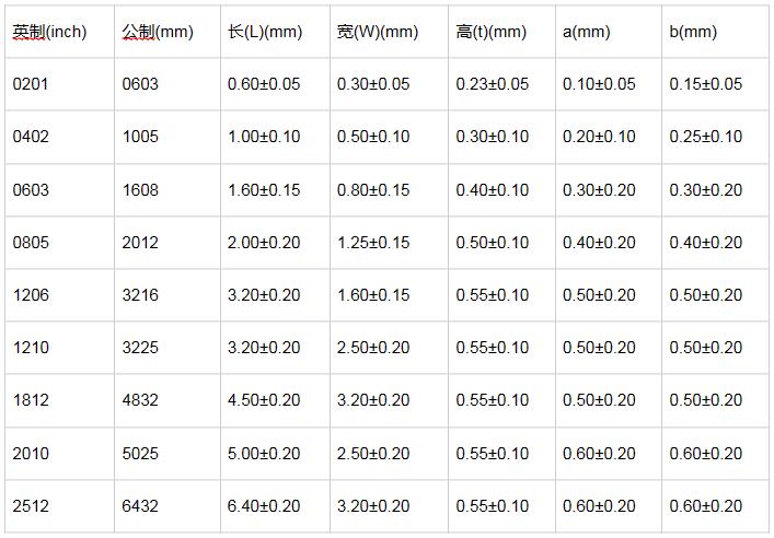 貼片電阻封裝尺寸功率對照表
