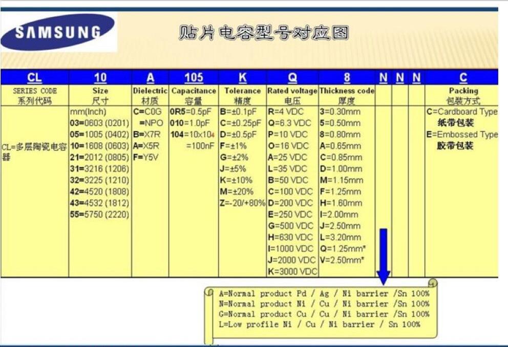 三星貼片電容耐壓值代碼:例如三星電容型號:CL10B103KB8NNNC,我們可以看到三星電容額定電壓字母B表示電壓50V,下面是三星電容耐壓代碼? 6 額定電壓:R=4V Q=6.3V P =10V O =16V A =25V L =35V B =50V C=100V D =200V E =250V G = 500V H = 630V I = 1000V J = 2000V K= 3000V